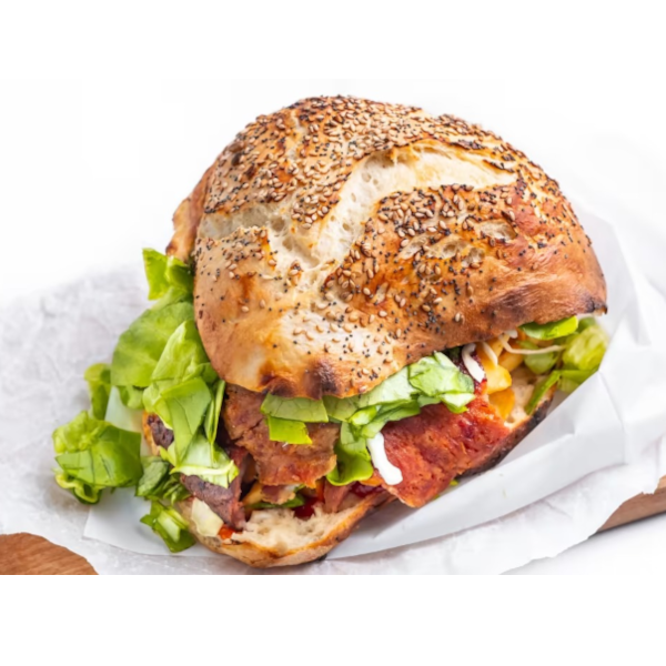 painică de casă, carne de pui & vită/vita și miel, cartofi, roșii, salată, ceapă, castraveți murați sosuri – 400 g
